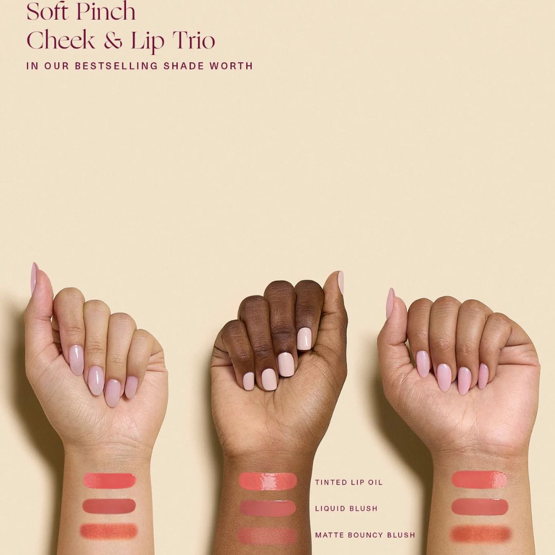 The Rare Beauty Soft Pinch Cheek & Lip Trio brings together three of the brand’s beloved Soft Pinch products to give you a coordinated, healthy-looking flush from cheeks to lips all in the universally flattering Worth shade (true rose). This travel-ready set includes a full-size Soft Pinch Matte Bouncy Blush, a mini Soft Pinch Liquid Blush, and a set-exclusive mini Soft Pinch Tinted Lip Oil, letting you create soft, buildable color with a matte, dewy, or glossy finish. Blends effortlessly, complements all skin tones, and makes a perfect gift or everyday essential.