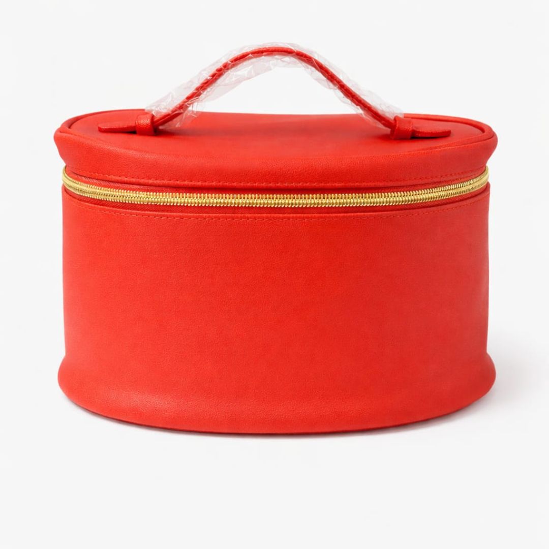 Keep your beauty essentials organized with this elegant red makeup bag, perfect for everyday use and travel. Made from smooth, high-quality material, it features a structured round design with ample space for makeup and skincare. The gold-tone zip adds a luxe touch, while the top handle ensures easy carrying stylish, practical, and travel-ready.